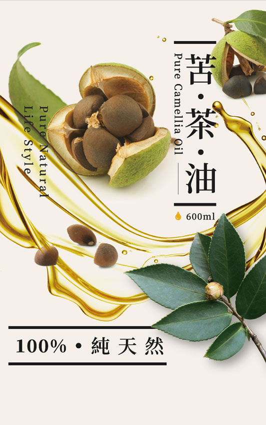 金黃色澤的100%純天然苦茶油加上純天然苦茶樹的枝葉、花苞及果實,能使人產生一種純天然、健康的意境感受,再搭配簡單的文案,就足以引發人們購買的慾望,品牌本身想帶給消費者的就是一種健康的生活態度。